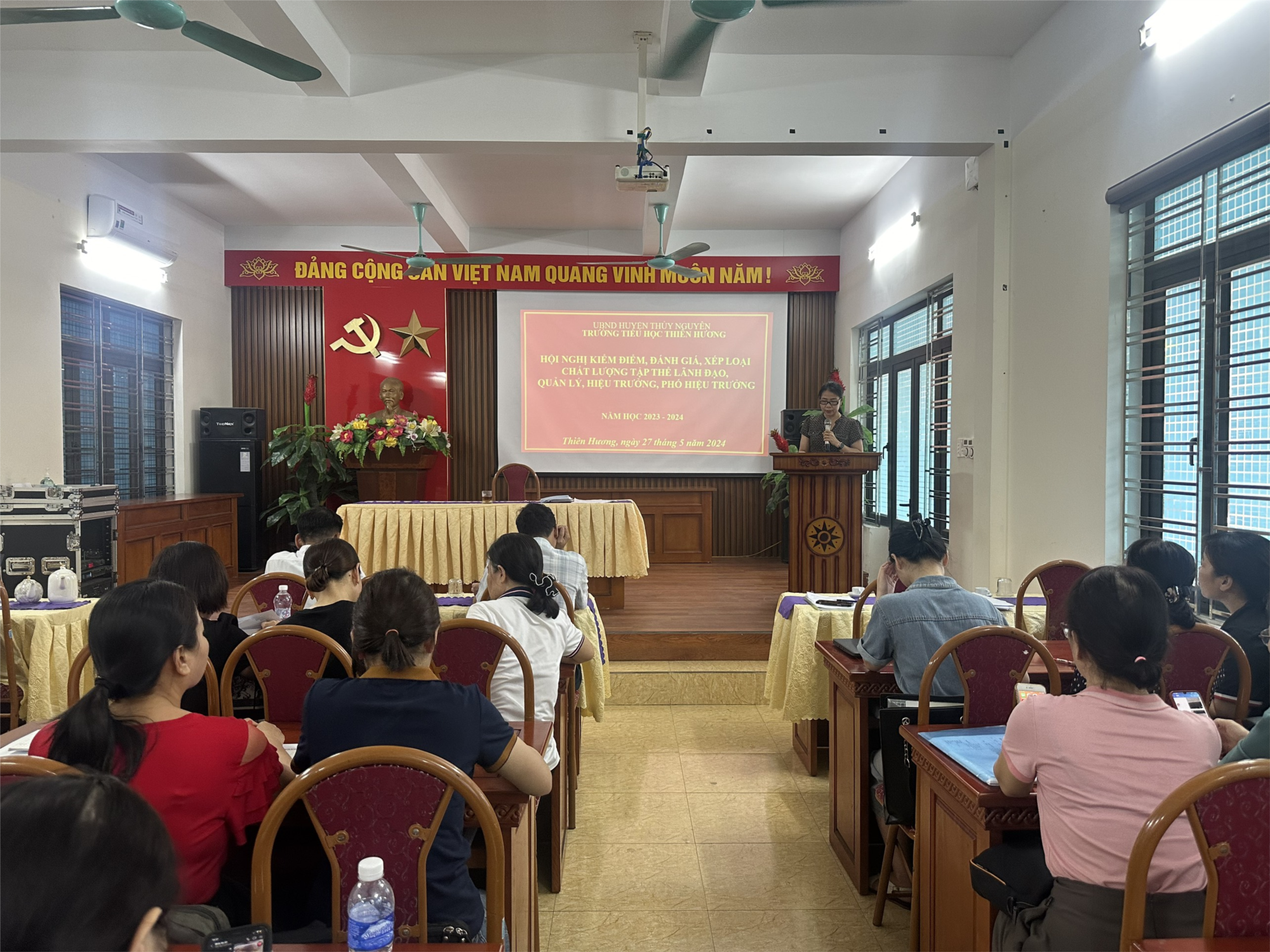 Chiều ngày 27/5/2024 trường Tiểu học Thiên Hương tổ chức hội nghị kiểm điểm, đánh giá, xếp loại chất lượng tập thể lãnh đạo, quản lý, hiệu trưởng, phó hiệu trưởng, với sự có mặt đông đủ của cán bộ, giáo viên, nhân viên nhà trường. Việc đánh giá này nhằm cải tiến công tác quản lý trường học.