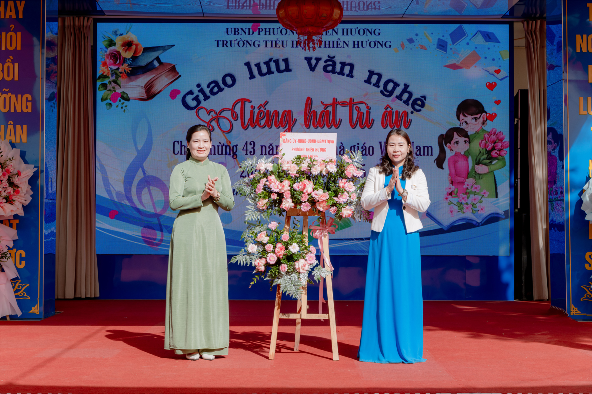 Đến thăm Trường Tiểu học Thiên Hương, đoàn lãnh đạo đã dành tặng nhà trường lẵng hoa tươi thắm cùng những phần quà đầy ý nghĩa đến toàn thể cán bộ, giáo viên, nhân viên. Những lời chúc chân thành, những cái bắt tay ấm tình đã thể hiện sự quan tâm sâu sắc của chính quyền phường đối với đời sống vật chất, tinh thần của đội ngũ nhà giáo. Những tình cảm ấy tựa như nguồn năng lượng tích cực, tiếp thêm động lực để thầy và trò Thiên Hương tiếp tục phấn đấu, sáng tạo, đóng góp vào thành tích chung của giáo dục địa phương.